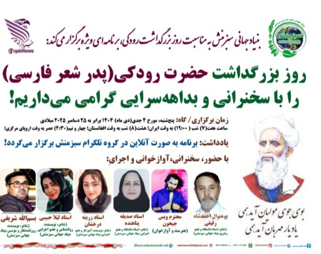 شامگاه پنجشنبه ۴ جدی/دیماه ۱۴۰۴ خورشیدی، آیین بزرگداشت حضرت #رودکی، پدر شعر فارسی، با محوریت سخنرانی، بداههسرایی، سرودخوانی، آهنگ و شعرخوانی، به همت بنیاد جهانی سبزمنش برگزار شد. این محفل ادبی ـ هنری، به مناسبت زادروز حضرت رودکی و با هدف پاسداشت زبان و ادب فارسی، نگاهی انسانی، فرامرزی و زبانمحور را در دل خود جای داده بود.