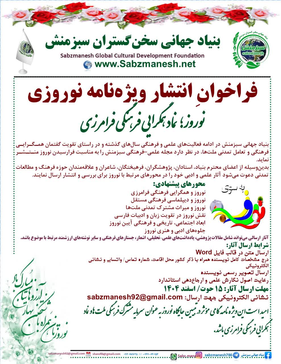 بنیاد جهانی سبزمنش در ادامه فعالیتهای علمی و فرهنگی سالهای گذشته و در راستای تقویت گفتمان همگرایی فرهنگی و تعامل تمدنی ملتها، در نظر دارد مجله علمی–فرهنگی سبزمنش را به مناسبت فرارسیدن نوروز منتشر نماید.